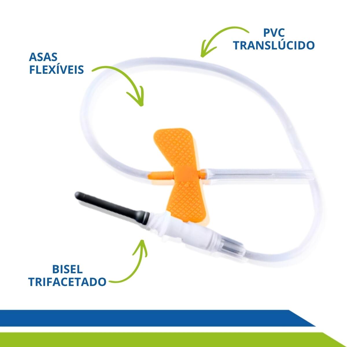 Fabricado com agulha em aço inoxidável, conta com bisel trifacetado que facilita a punção, além de tubo em PVC translúcido e asas flexíveis que auxiliam na punção venosa e na identificação do calibre. Na versão 25G (cor laranja), é indicado para coletas mais delicadas, com maior controle e precisão.